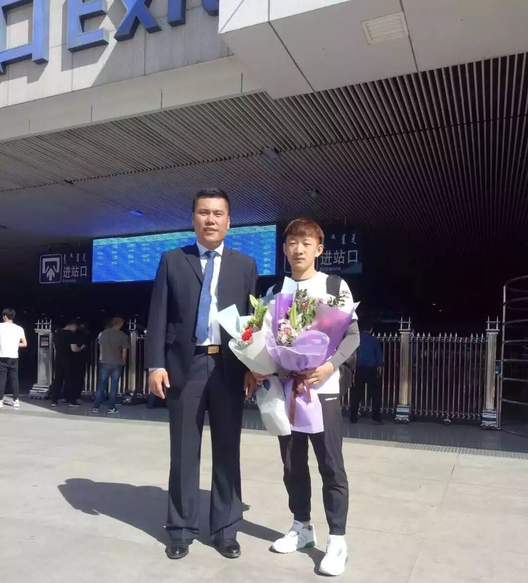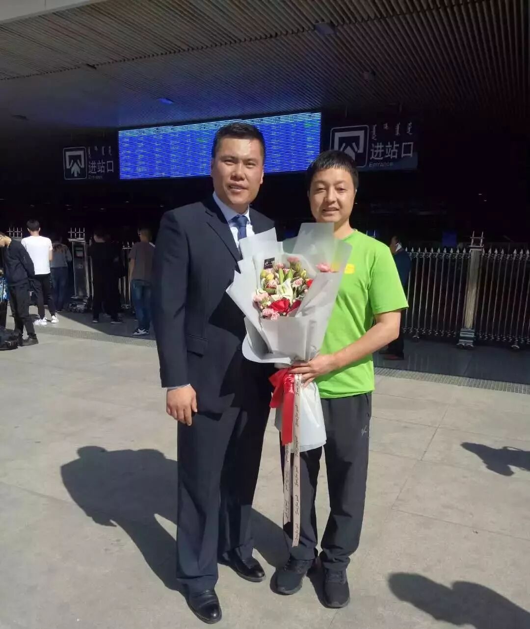 5月23日是健儿凯旋的日子,冯主席带领协会的工作人员手捧鲜花到车站迎接赵振宏和达来教练,鼓励他们不忘初心,再创佳绩!