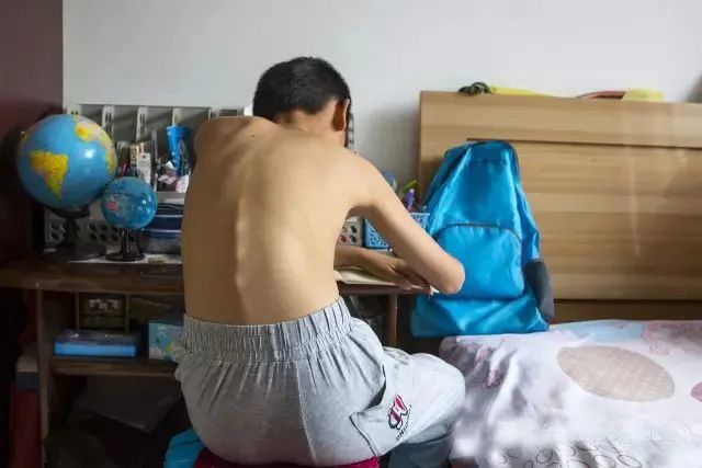 一个五年级的孩子在家写作业。家长说,由于作业多,孩子们写作业时很难长时间保持正确坐姿。孩子的脊柱小小年纪就变形的,有很多。